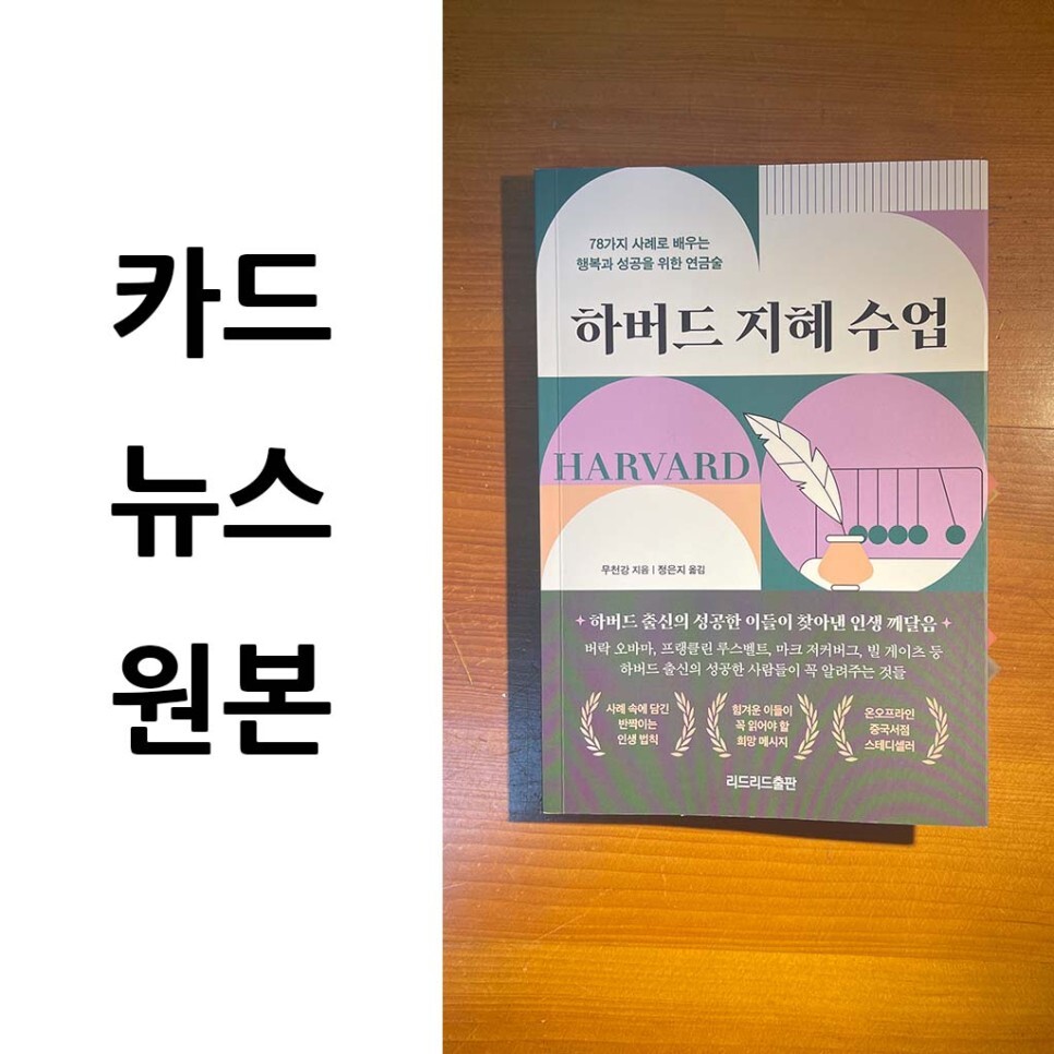 기존에 출판한 책들중에 [나는 하버드에서 인생을 배웠다], [하버드 부자수업]등 하버드 관련 책을 이미 출판 했습니다. 이 책은 기존에 나왔던 책들의 연장 느낌입니다. 아마도 새 책의 내용으로 카드뉴스가 또다시 생성 되겠죠?